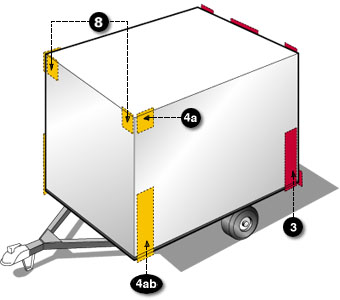 Exactly 2 pairs of 300mm long strips White On the rear upper corners - facing rearward At the top Reflex reflectors may not be required if they are replaced, in their required location, with conspicuity treatment