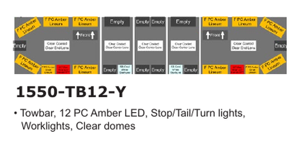 | 1550-TB12-Y | 58", 12 PC Amber LED, Towbar, stop/tail/turn lights, worklights, clear domes |